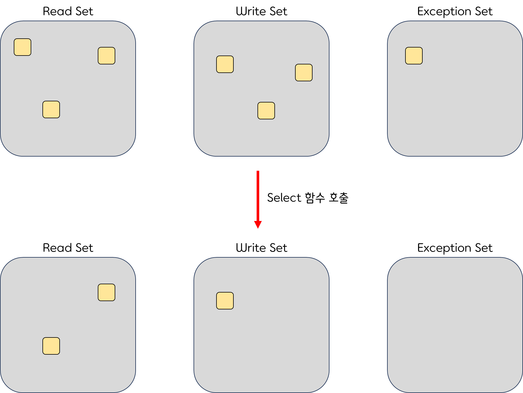 Select 함수를 호출하게 되면, 3개의 set에 변화가 발생한(현재 입출력 함수를 실행할 수 있는) 소켓만 남게 된다.