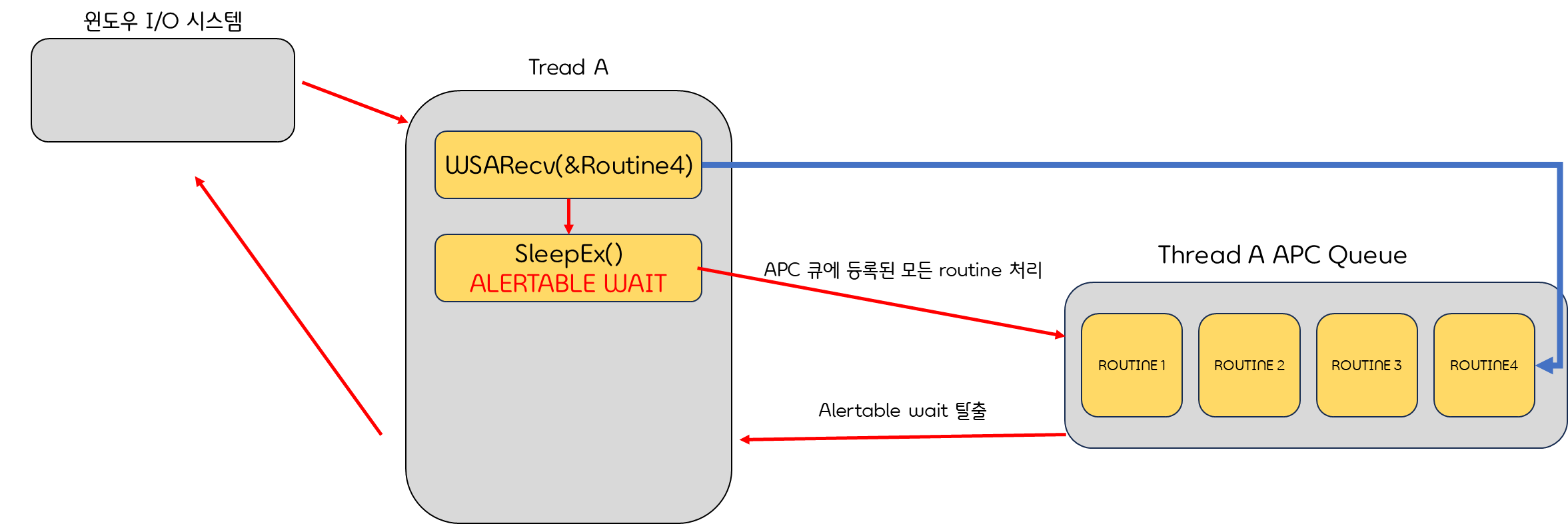 alertable wait 상태? => 운영체제의 메세지 수신을 대기하는 스레드 상태, alertable wait 상태 진입시 각 스레드 마다 존재하는 APC큐에서 모든 routine을 실행시킴.