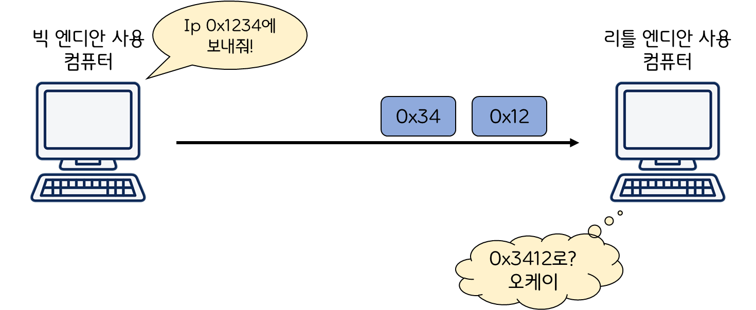 빅 엔디안 시스템 컴퓨터에선 0x1234라는 ip주소를 보냈지만, 그 정보를 받은 컴퓨터는 리틀 엔디안을 사용하고있었기 때문에 0x3412로 정보를 이해하는 상황이 발생해버린 것이다.