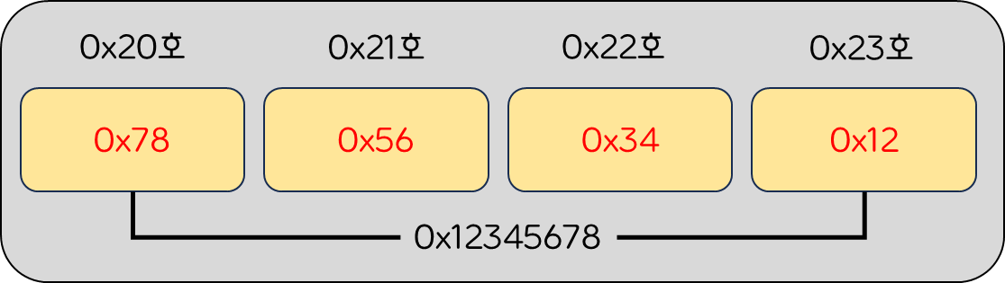 빅 엔디안은 최상위 바이트(0x12가 저장되어 있는 곳)이 가장 작은(가장 먼저 오는) 호(0x20호)에 저장된다.