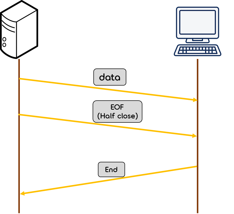 굳이 써야 할까? 그냥 모두 송/수신될 때까지 기다리는 방법은 잘못된 걸까? 여유가 있는 상황이라면 그래도 괜찮다. 하지만 데이터를 보낸 후 "End"라는 메시지를 보내야만 하고, 바로 연결을 종료해야 한다고 가정하면, Half-Close가 필요하다.