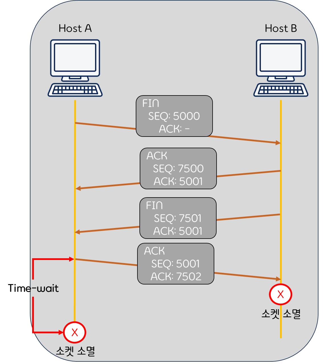 먼저 연결 종료 요청(FIN)을 보낸 Host A는 마지막 ACK를 보내고 소켓이 바로 사라지지 않고, 일정 시간을 대기하게 되는데 그 상태를 Time-wait이라고 한다.